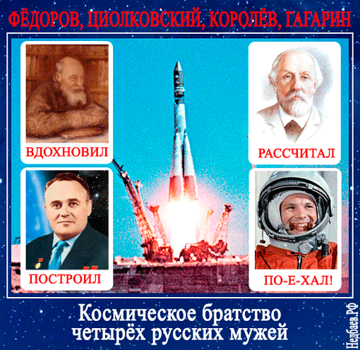 “Fyodorov ('Inspired'), Tsiolkovsky ('Calculated'), Korolev ('Built'), Gagarin ('Let's go!')”